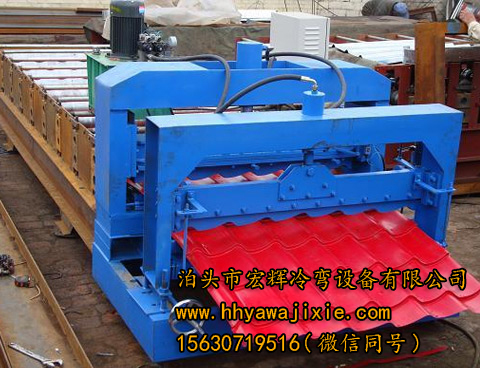1100型偏弧琉璃瓦壓瓦機(jī)輥道成型部分是由電機(jī)拖動(dòng),鏈條帶動(dòng)各輥轉(zhuǎn)動(dòng)。壓型部分是液壓缸帶動(dòng)模具上下移動(dòng),可以把彩鋼壓成許多節(jié),形似琉璃瓦。